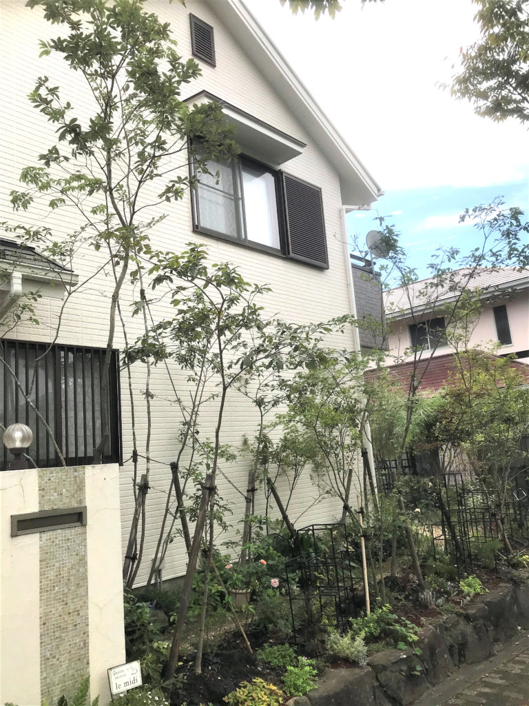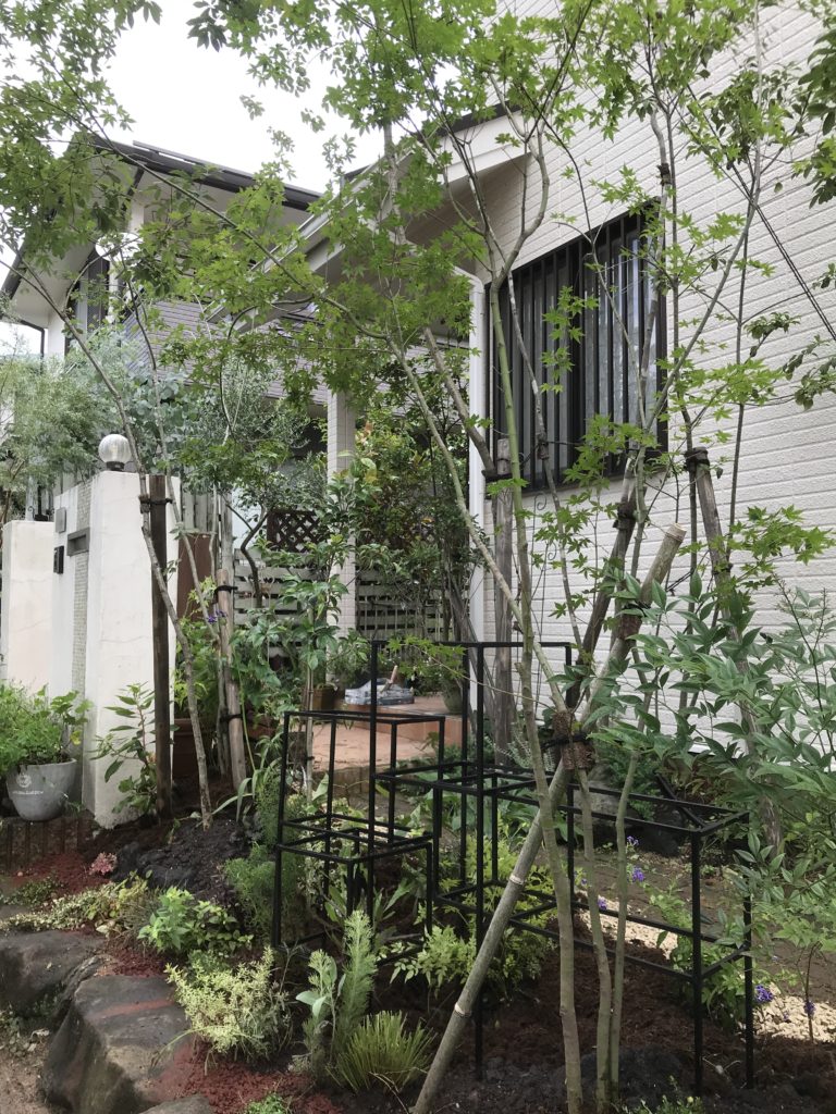 雑木とアイアンのオブジェで圧迫感のない、軽やかな境界をつくりました。